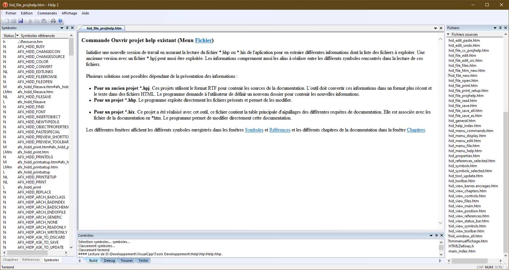 L’ensemble de fenêtres CDockablePane, dont la position est programmable par l’utilisateur permet de présenter des informations complexes (listes, arbres ou edit) qui dans notre exemple permettent de créer, convertir ou modifier une documentation intégrée de type WinHelp.